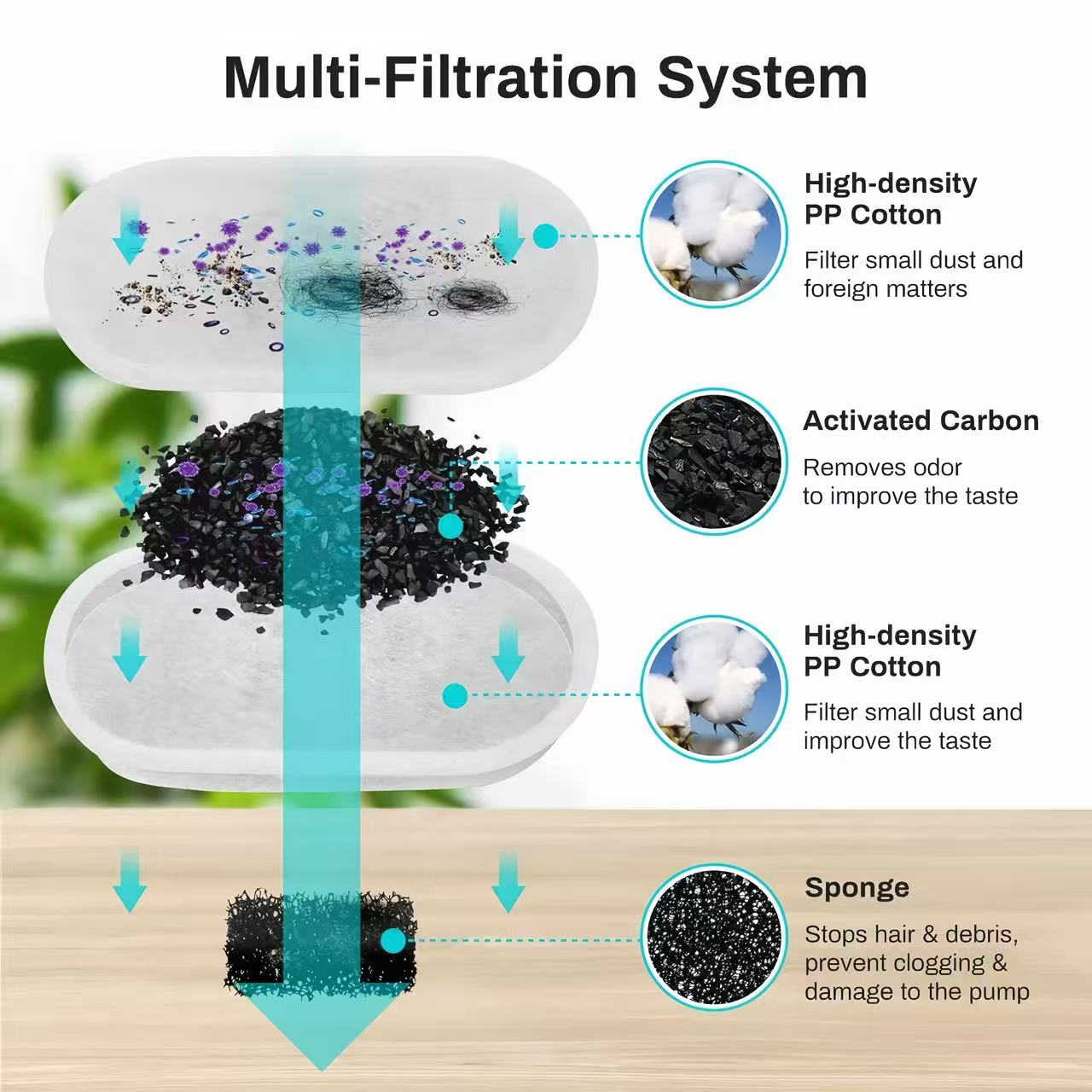 Multi-layer filter keeps water super clean—no more pet hair in water!